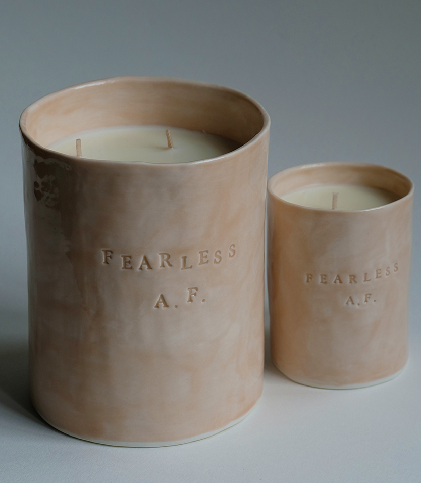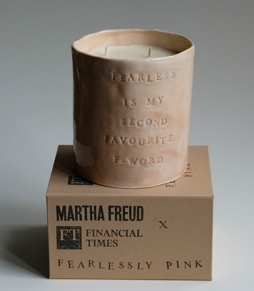 TheMartha Freud x Financial Times “Fearlessly Pink” collection was conceived to celebrate the newspaper’s 130thbirthday of printing on pink paper. A limited-edition series of exquisitely scented candles and refined tableware, all handmade by the artist herself, showcases Martha’s signature wordplay and consummate skill.