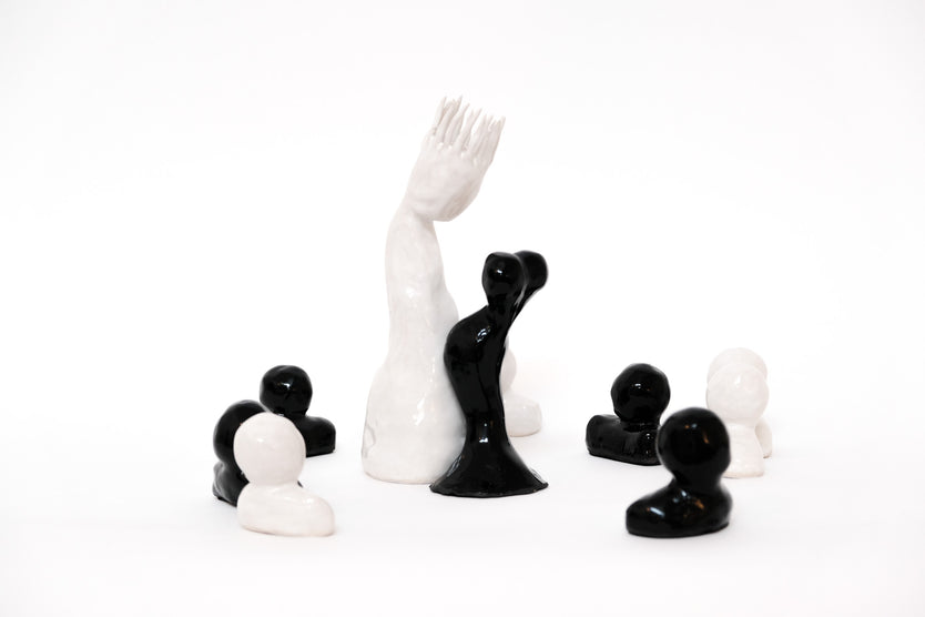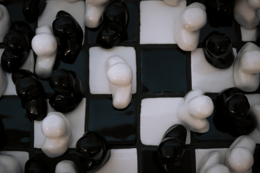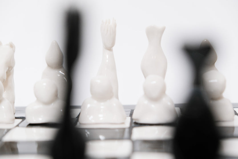 Freud plays with perceptions of power. This set is an observation on demography and the distribution of control and comfort. The aristocratic line is maintained with a “penthouse view” of the crowding pawns. They oversee the imbalance and rigidity that leaves no room to play.